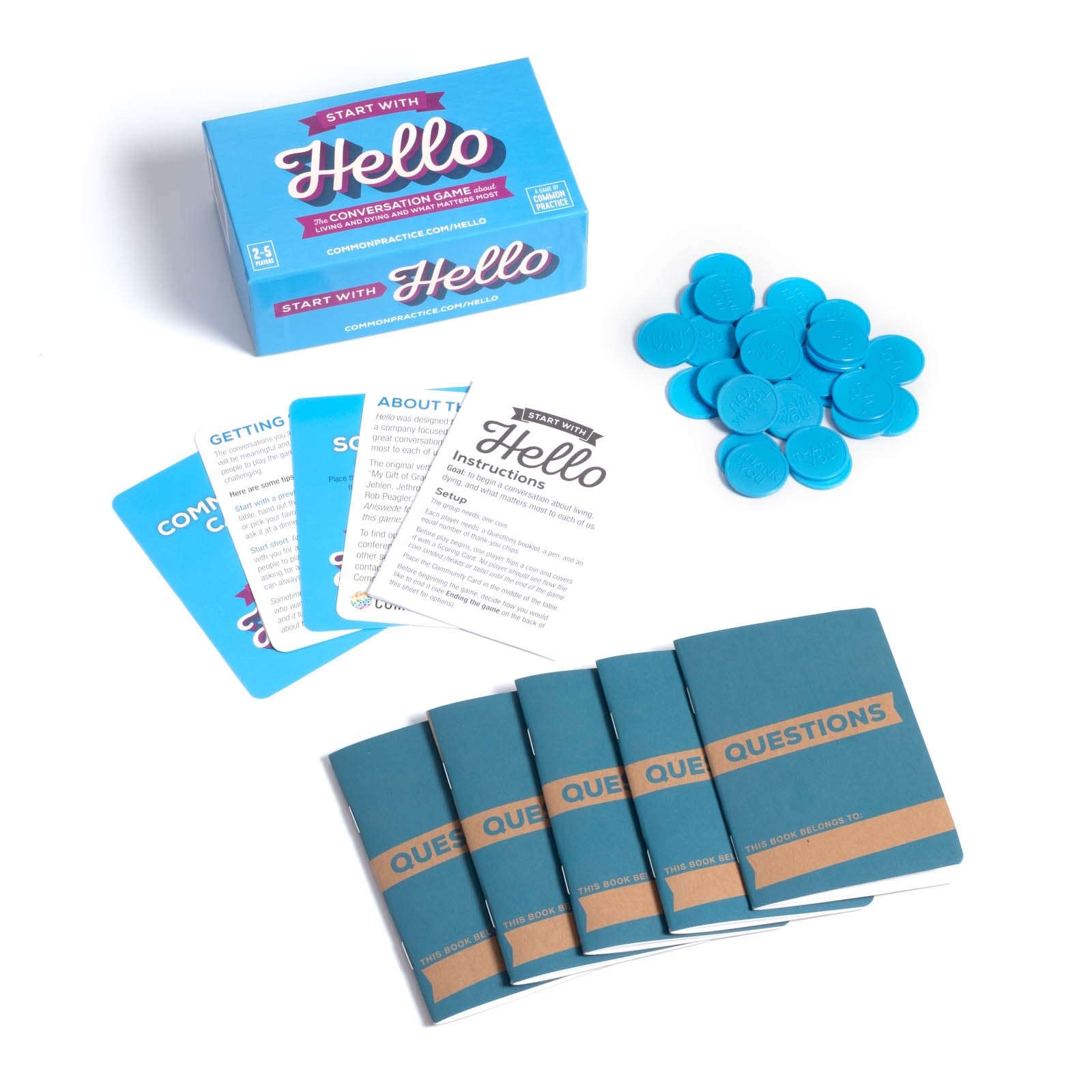 5 Questions Booklets 30 Thank-you chips Instruction Sheet Tips for inviting your friends and family to play